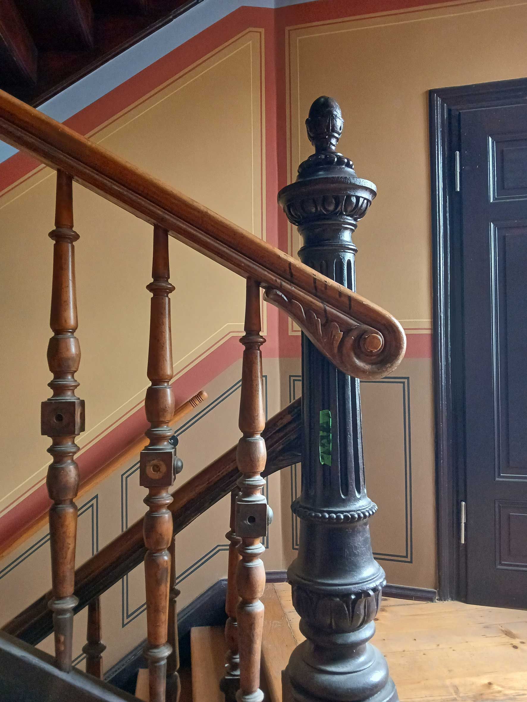 Die Gestaltung im Inneren ist eher frühgründerzeitlich mit einer handgemalten Mittelrosette an den Podestuntersichten und zahlreichen Linien und Bändern.