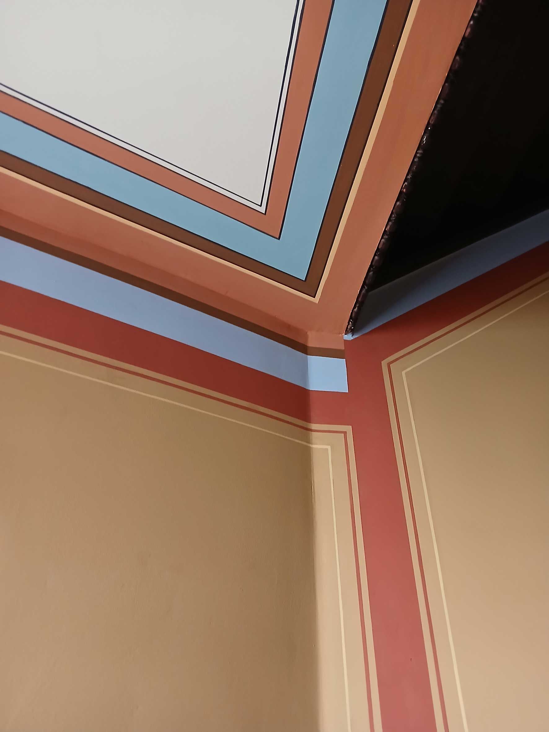 In den sonnigen Räumen an der Südseite entsteht gerade eine außergewöhnliche Ferienwohnung. Alle Räume haben bemalte Decken, die ersten zwei sind schon fertig.